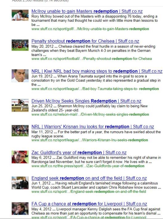The other online site The New Zealand Herald returns only about 1,000 results. Redemption and sports gets a paltry 70 results.