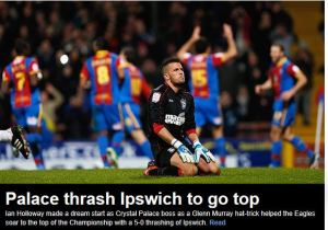 Ian Holloway could hardly have wished for a better start to his new job as Crystal Palace boss as a Glenn Murray hat-trick helped the Eagles soar to the top of the Championship with a 5-0 thrashing of Ipswich.