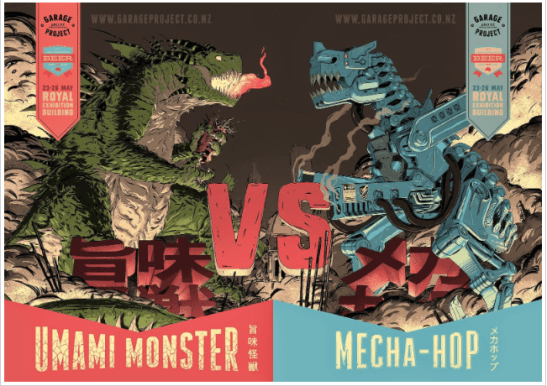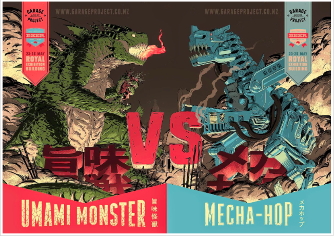 Tim Gibson artwork for Wellington brewery Garage Project’s latest beers: Umami Monster & MECHA-HOP! Copyright Garage Project 2014