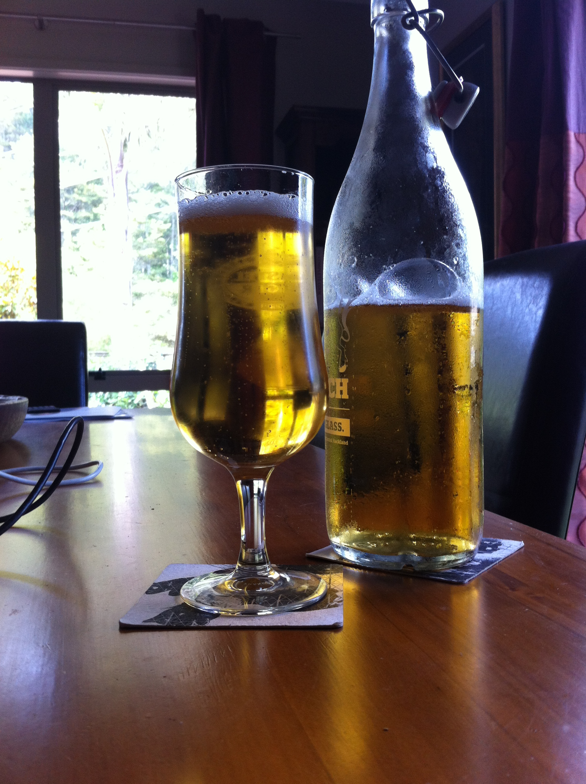 Malty wet aroma on popping the flip lid, and a real hiss, seems well carbonated. Lovely yellow golden colour and it pours with a head that is small and seems persistent.