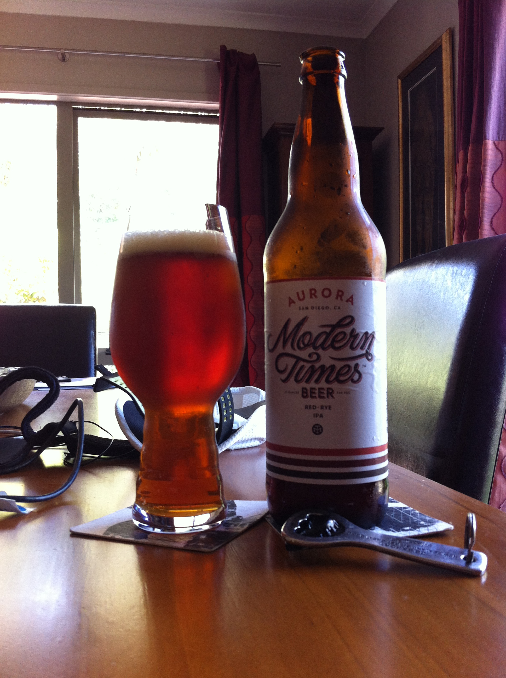 Brewed by Modern Times Beer in the style that is either Amber Ale or American IPA San Diego, California USA. I can’t find a Red IPA, Consensus might be Amber ale. I sit on the fence.