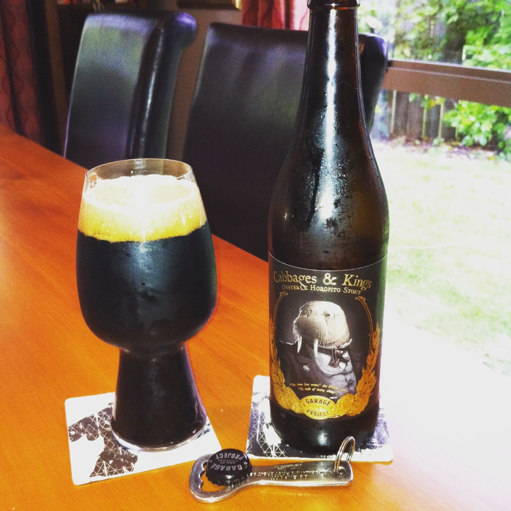 Cabbages & Kings, Imperial Oyster Stout, brewed with the more or less willing assistance of ten dozen fresh Te Matuku Bay Pacific oysters, Horopito and Manuka smoked malt.