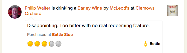 At 3.25 stars from 5, the worst of the McLeod’s beers is the Mcleods Barley Wine, which I rated 3.25. 3.25 is not the worst rating that I’ve ever given a beer. But 3.25 is the worst rating amongst the Barleywine beers that I’ve logged.