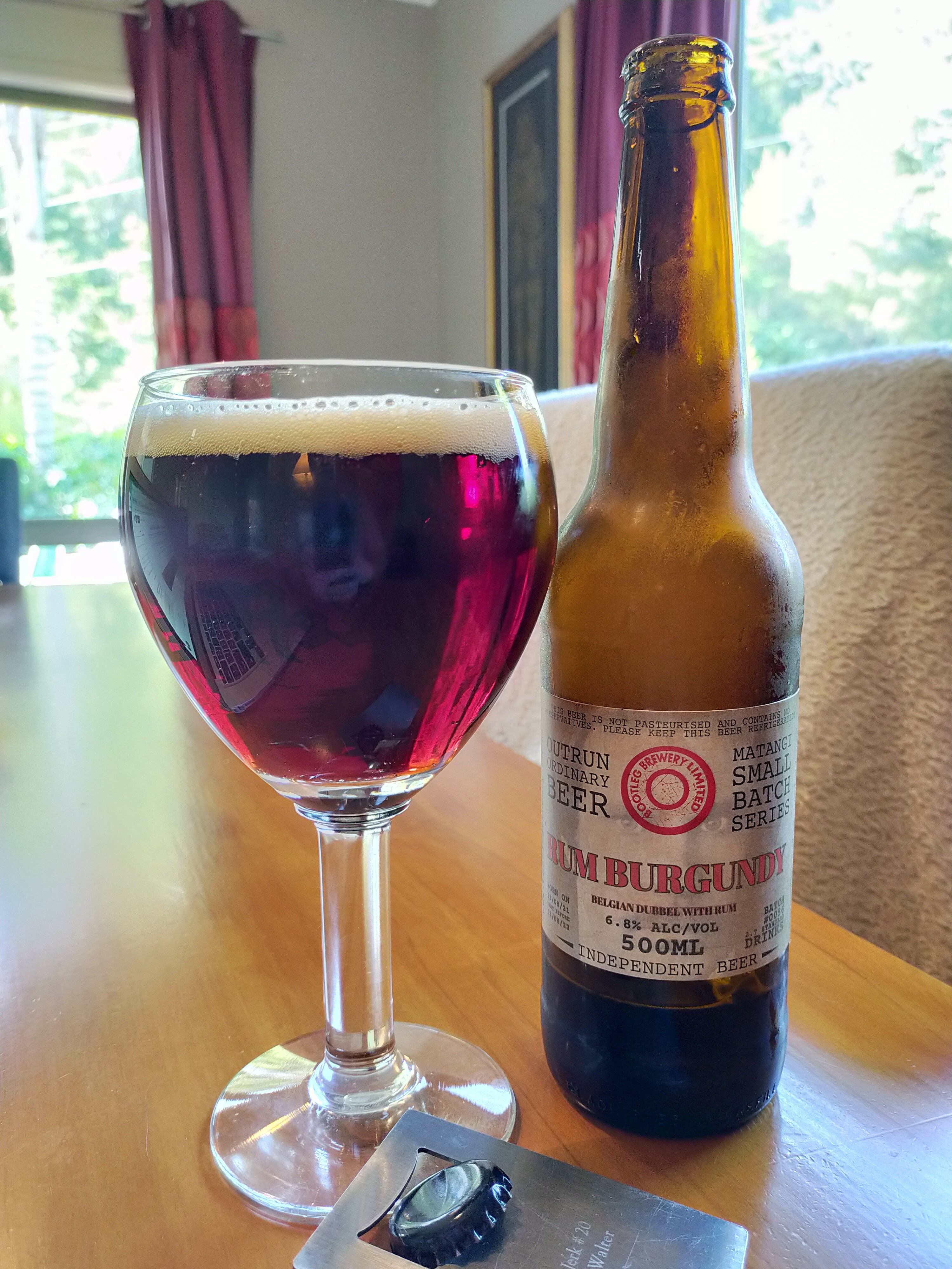 Bootleg Rum Burgundy Belgian Dubbel. Bootleg produce some top shelf product, regularly and I’m a big fan of that. I’ve got this one to kick me off. I quite the Belgium beer, and a Dubbel, well, what a thing to see in New Zealand, they’re not commonly made here, but they are almost uncommonly good.