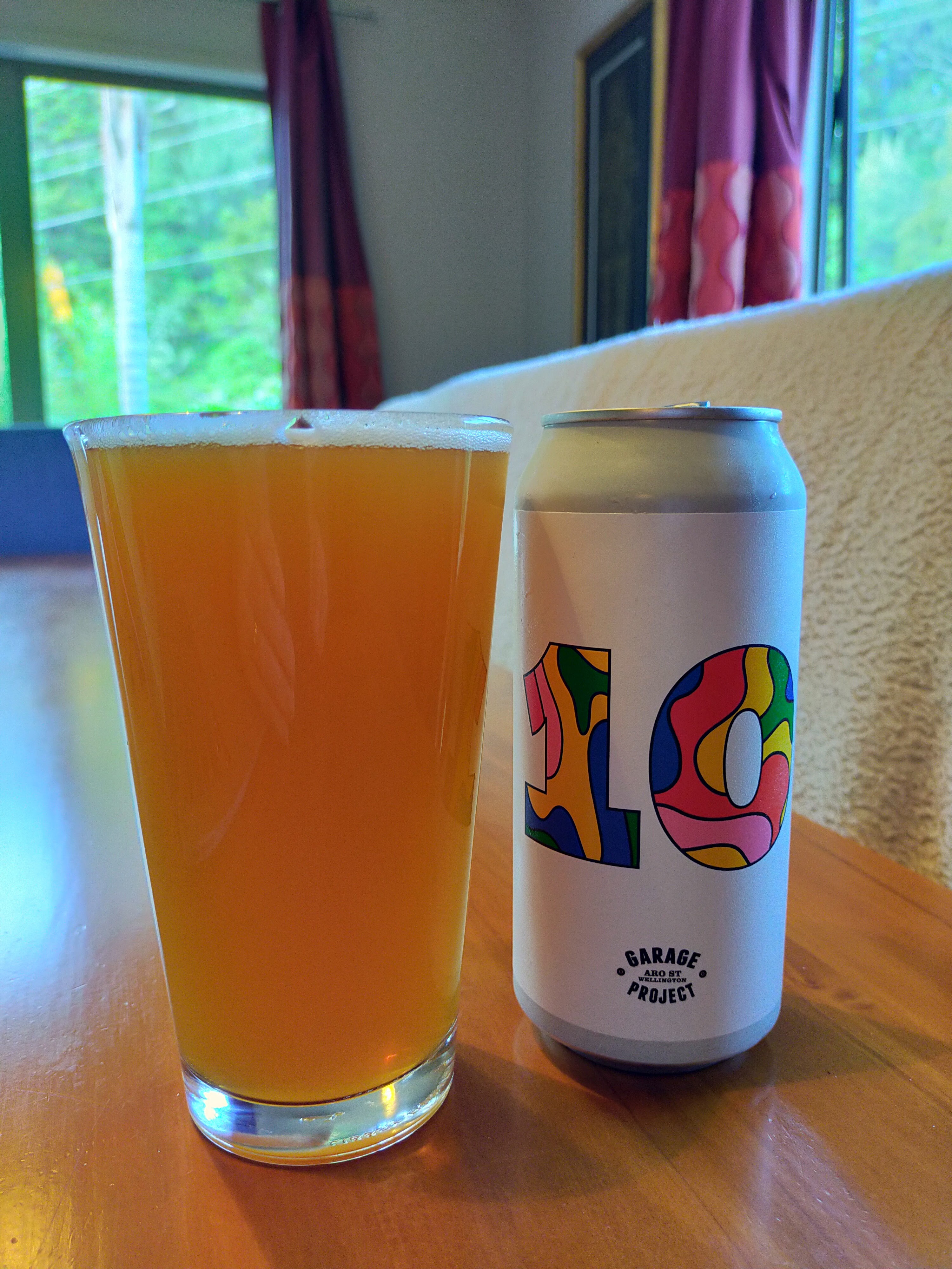 Garage Project of course brew the Garage Project 10 and they do that in Wellington, 🇳🇿  New Zealand. It is labelled as a Triple but let’s go with the more obvious IIPA DIPA – Imperial / Double Hazy (NEIPA)  with an ABV of  10.0% – this is 3.5 standard drinks in NZ