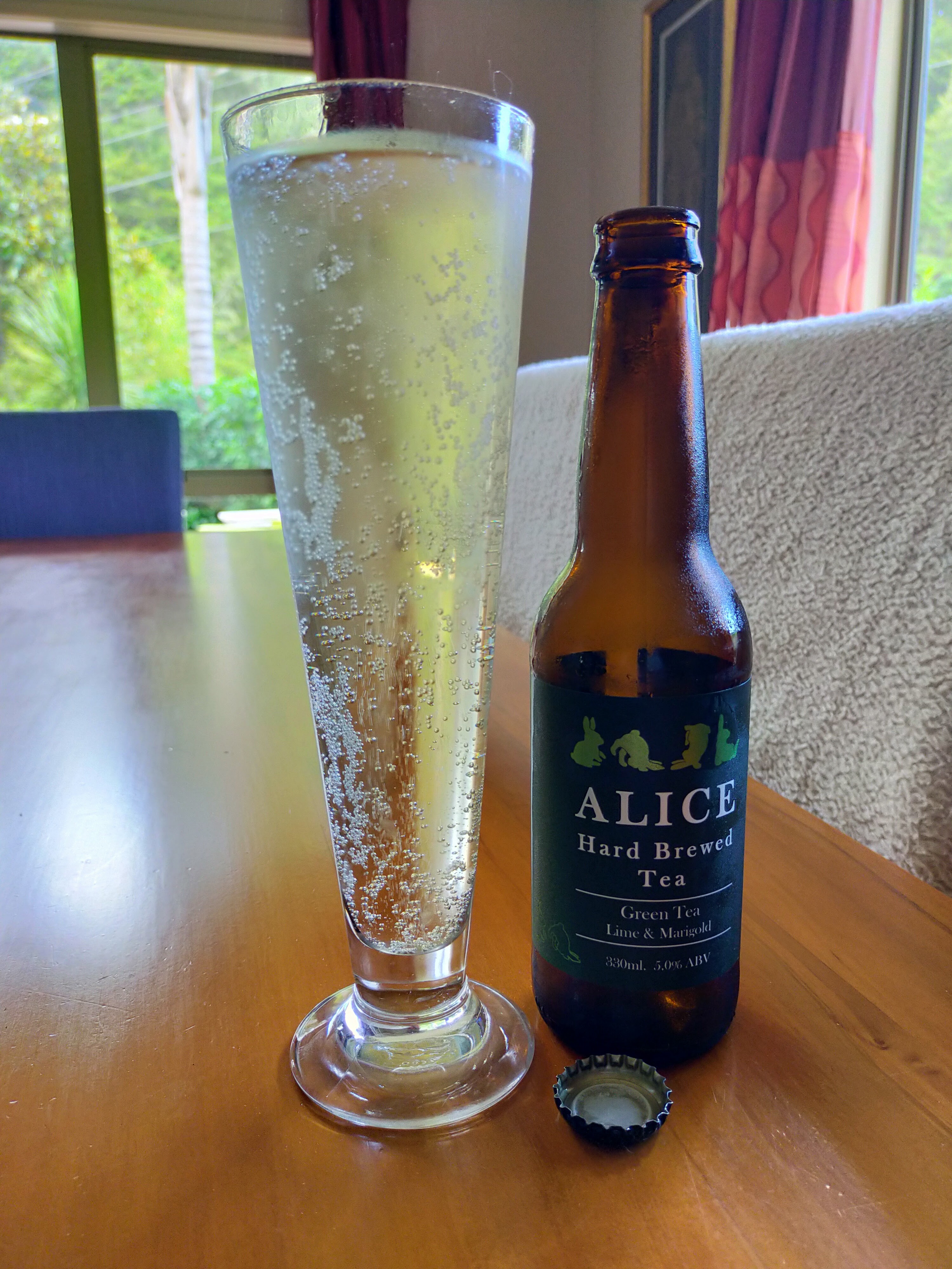 A 330ml bottle of alcohol Tea at 5% – making this 1.3 standard drinks in NZ. Alice is a Premium Tea Brewing company based in beautiful Pokeno – just south of the Bombay Hill.