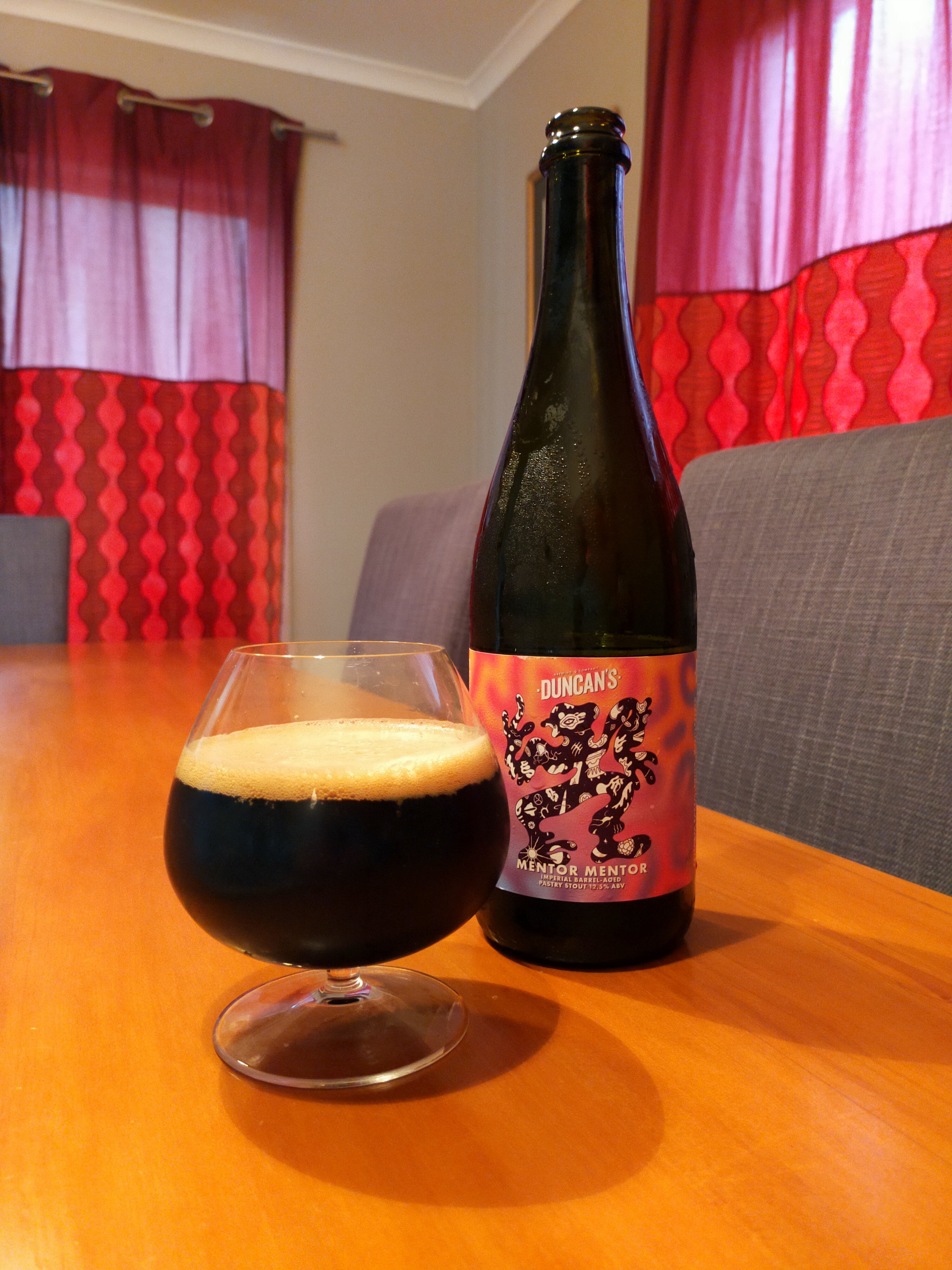 Duncan’s Brewing Co. make the Duncan’s Mentor Mentor in Paraparaumu, Wellington, 🇳🇿 New Zealand in the style that is of course Stout – Imperial Flavored / Pastry. Mentor Mentor has an ABV of 12.1%, making it 7.4 standard drink units in NZ